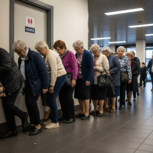 Cohue dans la file d’attente, la troupe de cheveux argentés, se précipite au petit coin.